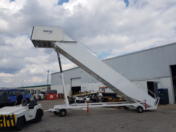 These used non-motorized aircraft boarding stairs from Airside GSE are constructed of heavy gauge steel and aluminum. The steps also have a servicing height range of 90 to 228 inches. Other features include a tow bar hitch and a retractable platform with privacy wings running the entire length of both sides. We have several other types of aircraft passenger steps in stock, please contact if you do not see what you require.