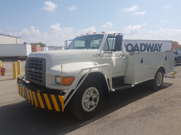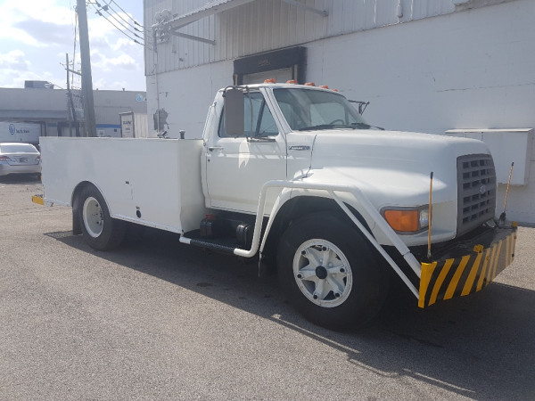 Used Stinar SLS-500 Lavatory Truck is built on the bed of a 1995 Ford F700 and runs on gasoline. It has a 64 inch (1.6 m) rear service deck height. 79,200 miles and 6,956 hours of operation. 590-gallon (2233 L) waste, 300-gallon (1135 L) blue flush/rinse tank capacity