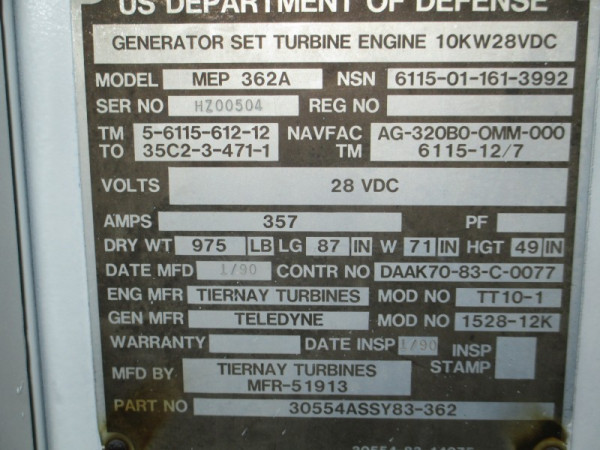 Used 1990 Tiernay MEP 362A Aircraft Ground Power Unit (GPU); The MEP 362A can provide 10KW/ 28 Volts and has 310 recorded service hours. The aircraft gpu will be fully serviced, load bank tested, and freshly painted prior to shipment.