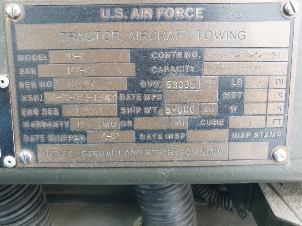 Used 1982/ 2003 Stewart & Stevenson, diesel, MB2 aircraft tug/ pushback tractor with low hours and miles. This MB2 may be from 1982 but it underwent a full military overhaul in 2003. The unit weighs 53,000-lbs, is rated to have 30,000-lbs DBP, and is also equipped with 4-wheel steer. It registers 1,127 miles and 1,396 hrs on the meter. When fully refurbished by us, the MB2 will be freshly painted, have a rebuilt engine, and will have been recently serviced.