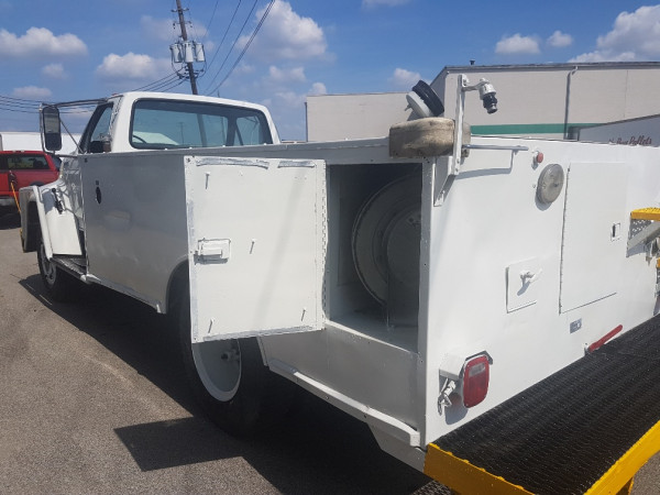 Used Stinar SLS-500 Lavatory Truck is built on the bed of a 1995 Ford F700 and runs on gasoline. It has a 64 inch (1.6 m) rear service deck height. 79,200 miles and 6,956 hours of operation. 590-gallon (2233 L) waste, 300-gallon (1135 L) blue flush/rinse tank capacity